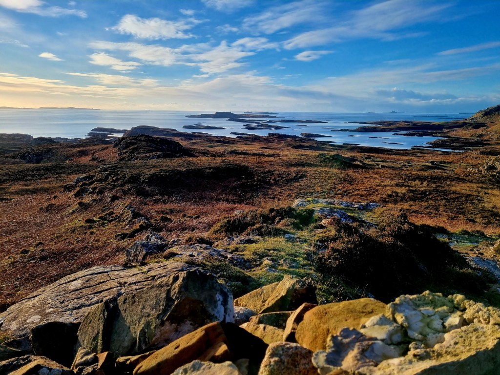 The Isle of Ulva is an island of contrasts from the open vastness of its southern side with its stunning views out over the archipelago of islets in Craigaig Bay and further across to Little Colonsay, Staffa, and Iona. Contrast this with the mature woodland of its eastern side with an amazing variety of fungi and lichens.